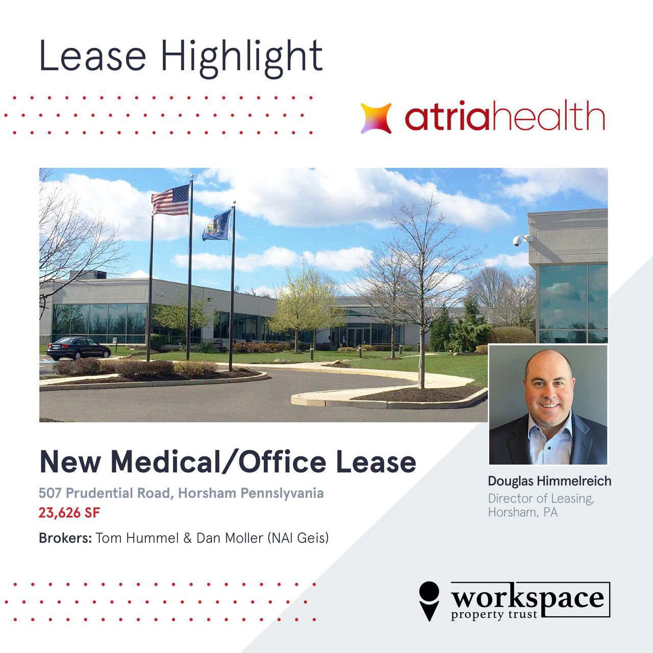 Welcome atria health, our new tenant of 23,626 sq. ft. at 507 Prudential Road! Thank you to our broker partners Tom Hummel and Daniel Moller of NAI Geis and our very own Doug Himmelreich for helping land the deal. Another great addition to our market in Horsham, PA!