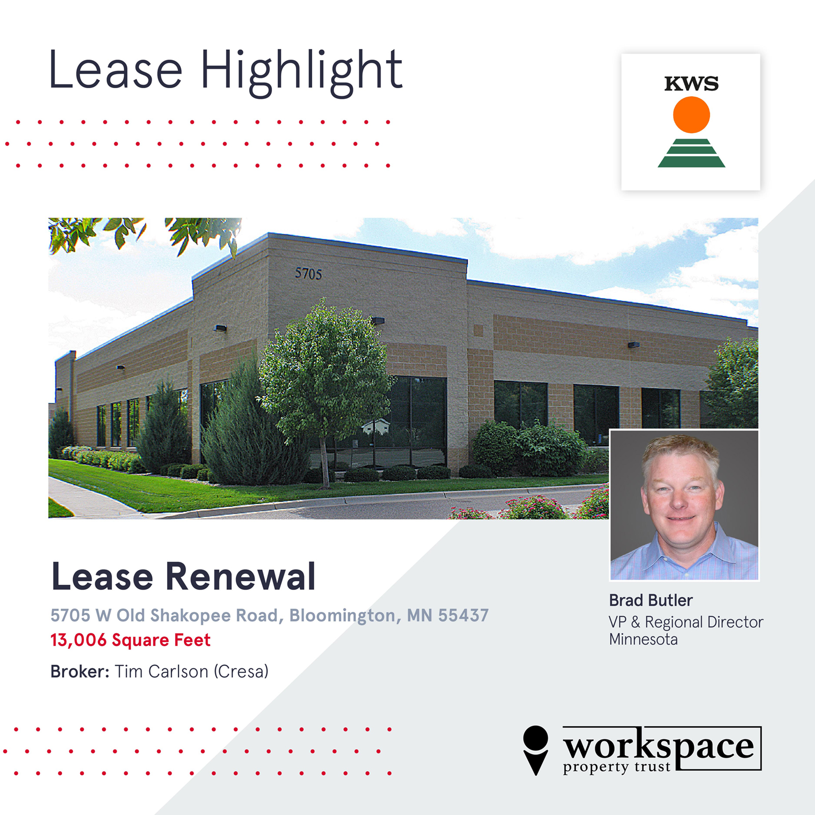 Workspace is thrilled to announce the renewal of our lease agreement with KWS Group for 13,006 SF office space at 5705 W Old Shakopee Rd in Bloomington, Minnesota!