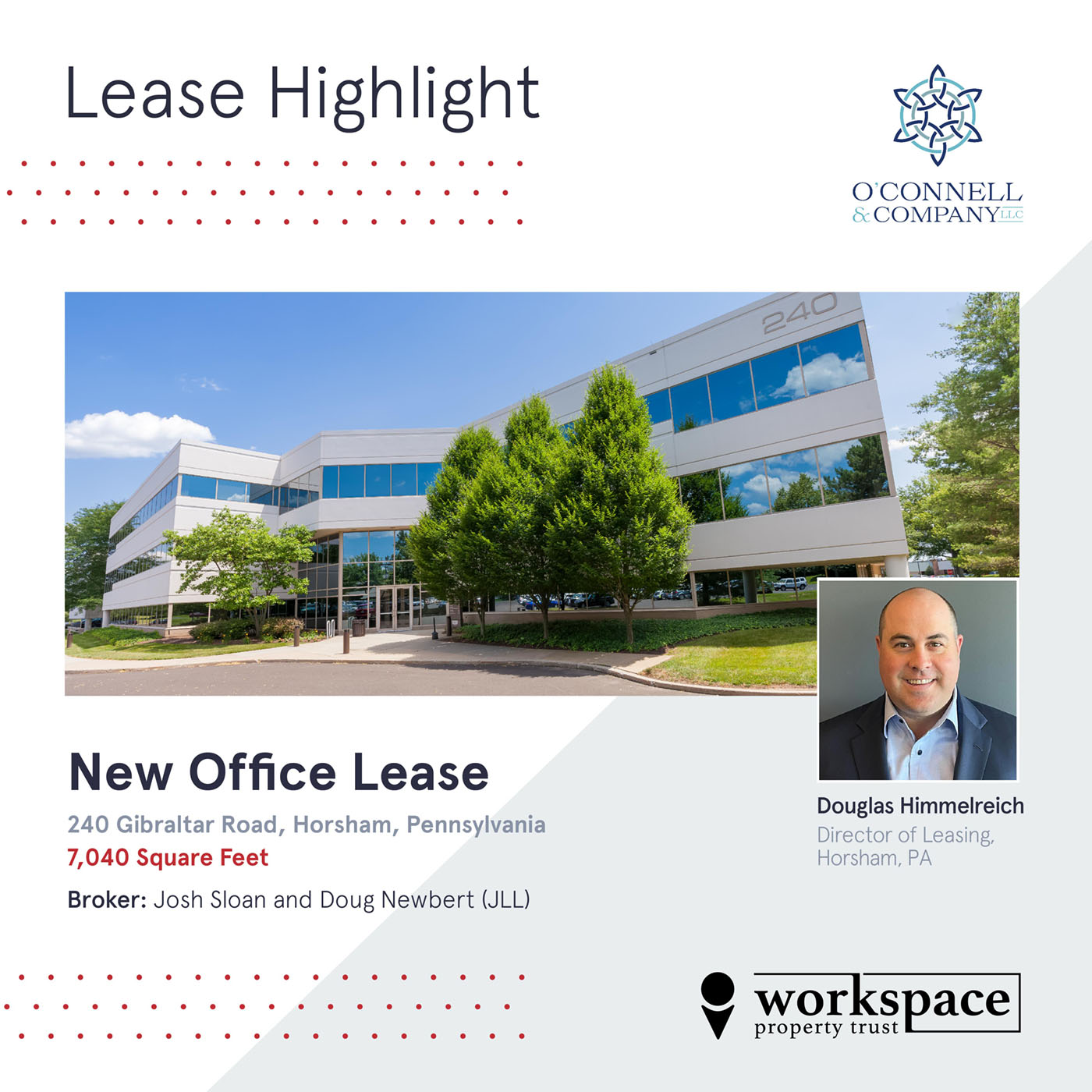 Workspace Property Trust is happy to welcome our new tenant, O'Connell and Company, LLC, who has leased 7,040 SF at 240 Gibraltar Rd as part of our Horsham portfolio! We’re thrilled to have them as part of our growing community and look forward to their continued success!