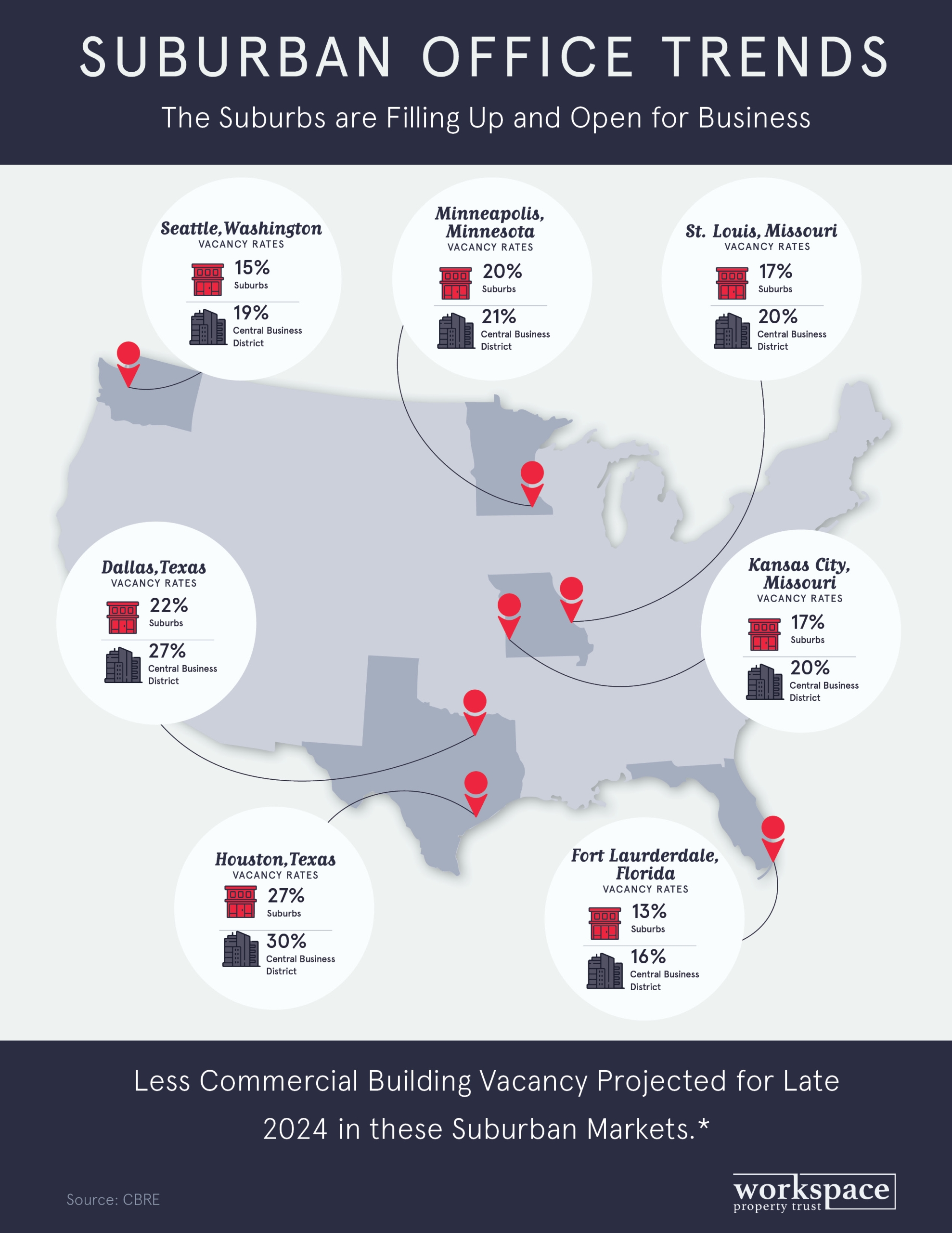 With more people working "flex" schedules, there is demand for convenience, increased work/life balance, and offices that are closer to home and community. The expected vacancy rate gap between the suburbs and the CBD tell the tale. This includes several of our Workspace markets: Seattle, Minneapolis, St. Louis, Kansas City, Fort Lauderdale, Houston and Dallas.