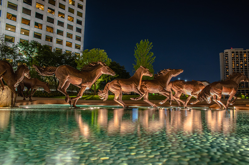 Marvel at the iconic bronze sculpture depicting wild mustangs galloping across a granite stream, a tribute to Texas' western heritage.